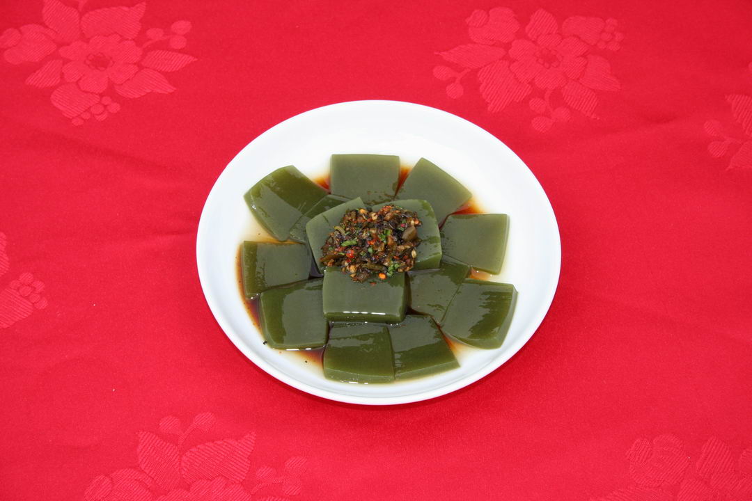 外形四四方方,顏色翠綠非常,口感爽滑Q彈。吃的時(shí)候放上辣椒、醬油、醋以及蔥姜末、大蒜水等佐料攪拌一下,然后送入口中,清涼爽滑的感覺定會(huì)讓人欲罷不能。